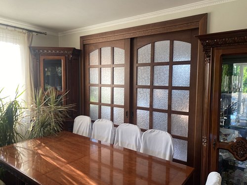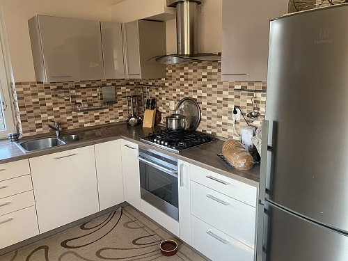 - priestranná kompletne vybavená kuchyňa so značkovými spotrebičmi, ktorá je prepojená posuvnymi dverami z dubového dreva s halou,